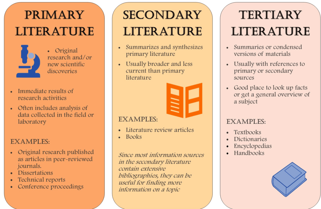 The distinction between primary, secondary, and tertiary sources is based on how far the information source is developed from the original event or occurrence. Is it firsthand information? Is this a second-hand translation? Is it possible to get a third-hand synthesis and overview of what’s known?